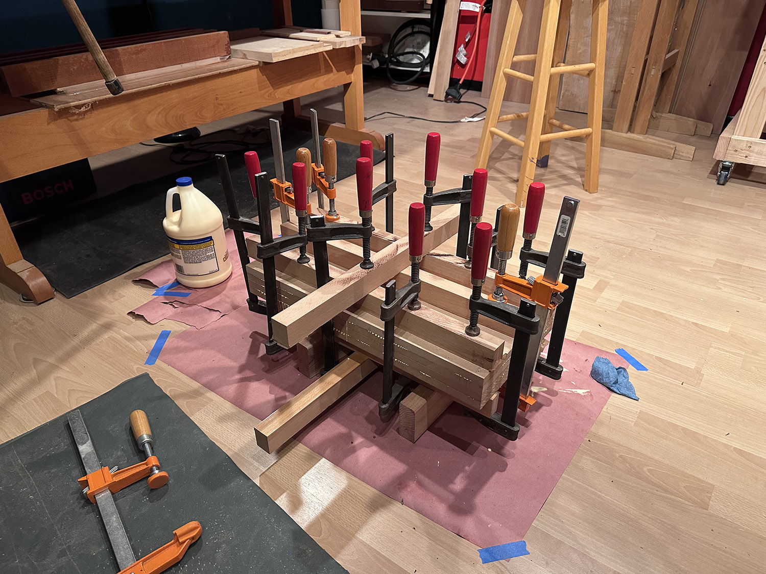 the first guitar jig: gluing together four layers of mdf for the body form.