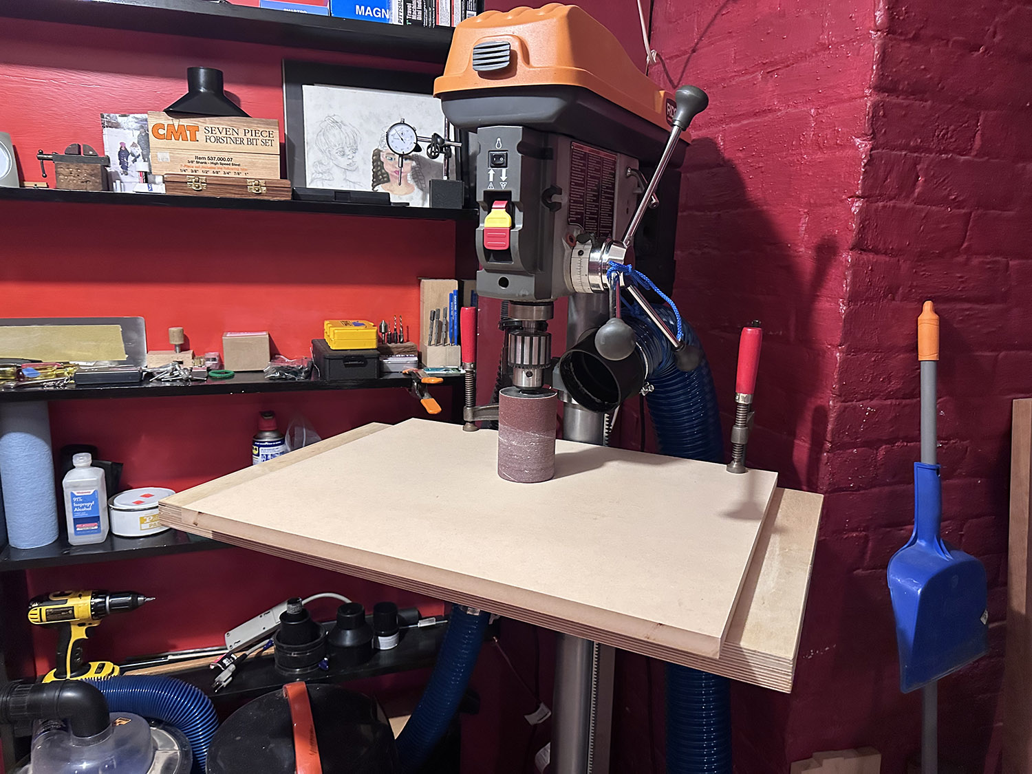 additional table for drum sanding on drill press provides space for arbor that extends past the drum, hopefully controlling lateral forces.