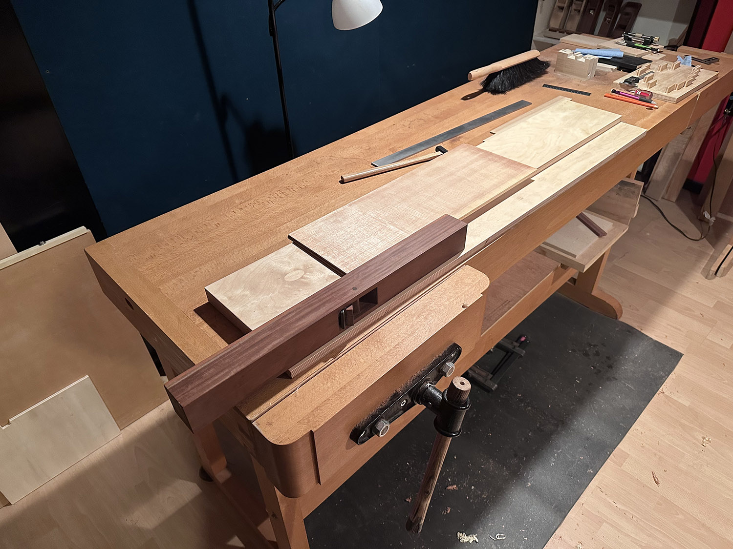 i made this jointing plane for the book matched madrone panels 20 years ago. amazingly the ipé body and gonçalo alves sole have remained true, making it quite easy to prep the top and back joints.
