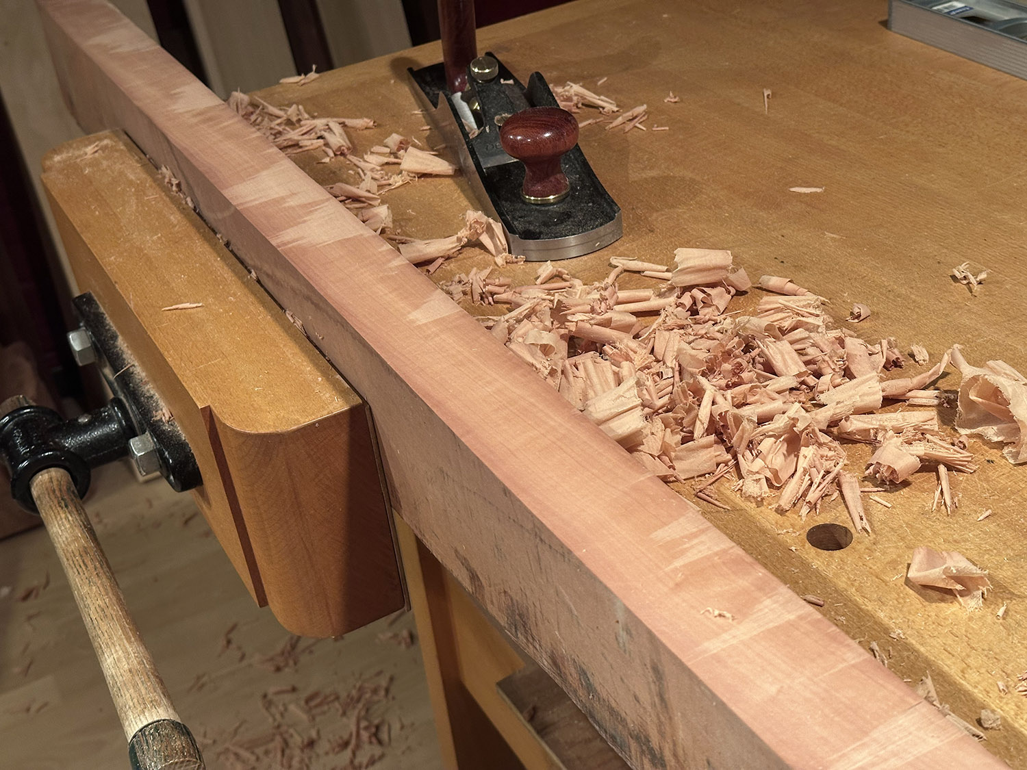 the planed surface is smooth and visually soft. there's a slight curl in the grain.