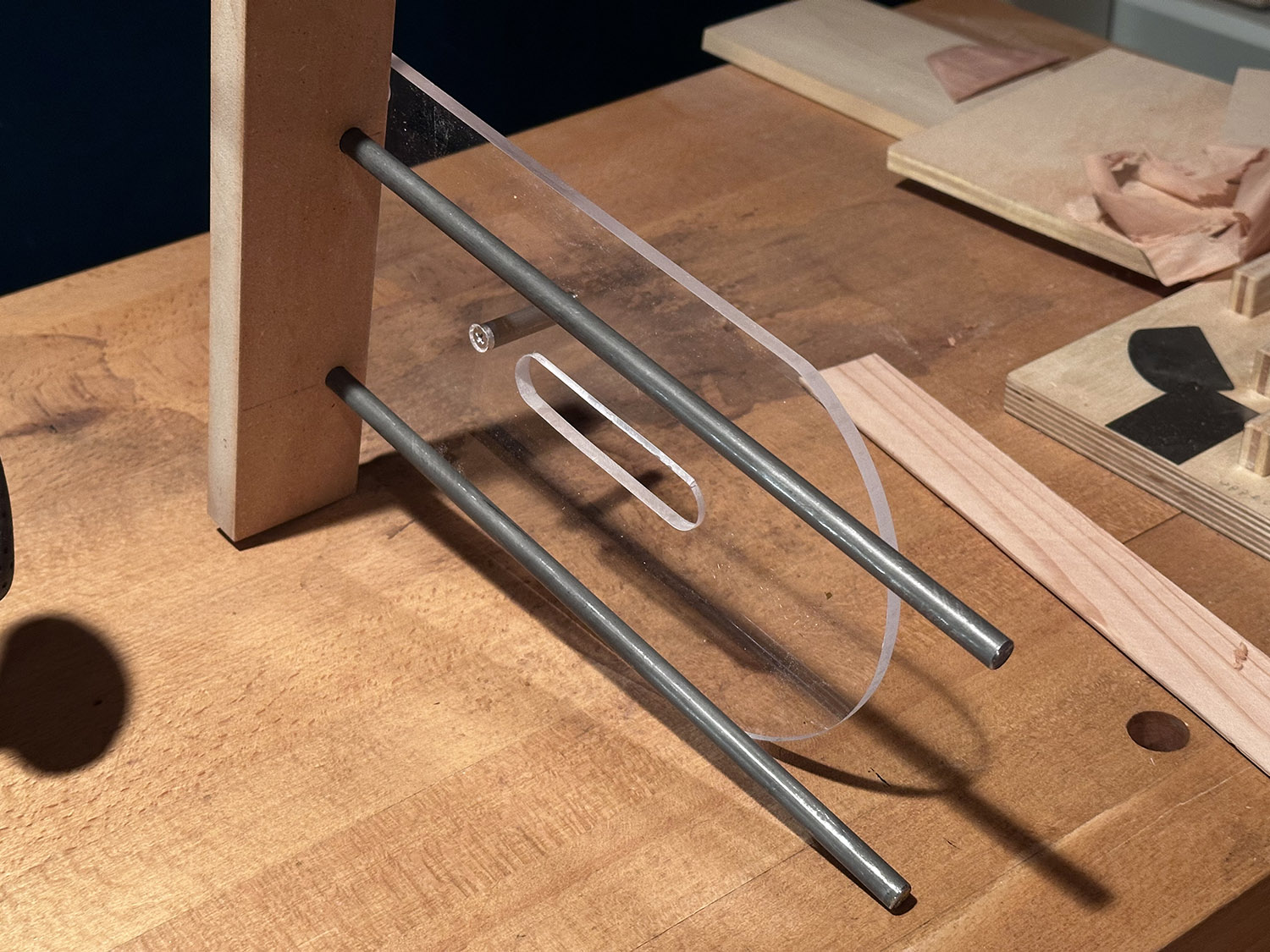 a handheld router fence and circle cutting jig to be used in creating the rosette and cutting the sound hole. made from 1/4" acrylic, 3/8" steel rod and a block of mdf.