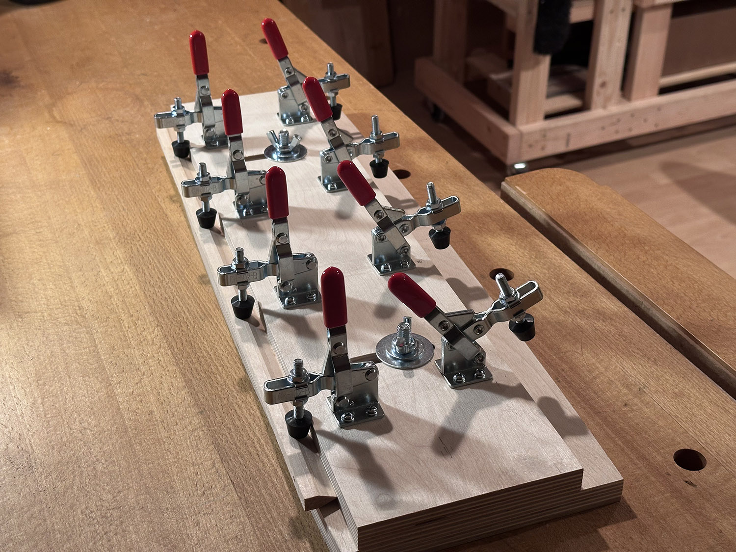 jig to route top and back curves to braces. one side has curvature of the top, the other the back. the center section with toggle clamps can be adjusted in reference to lower curved edges.