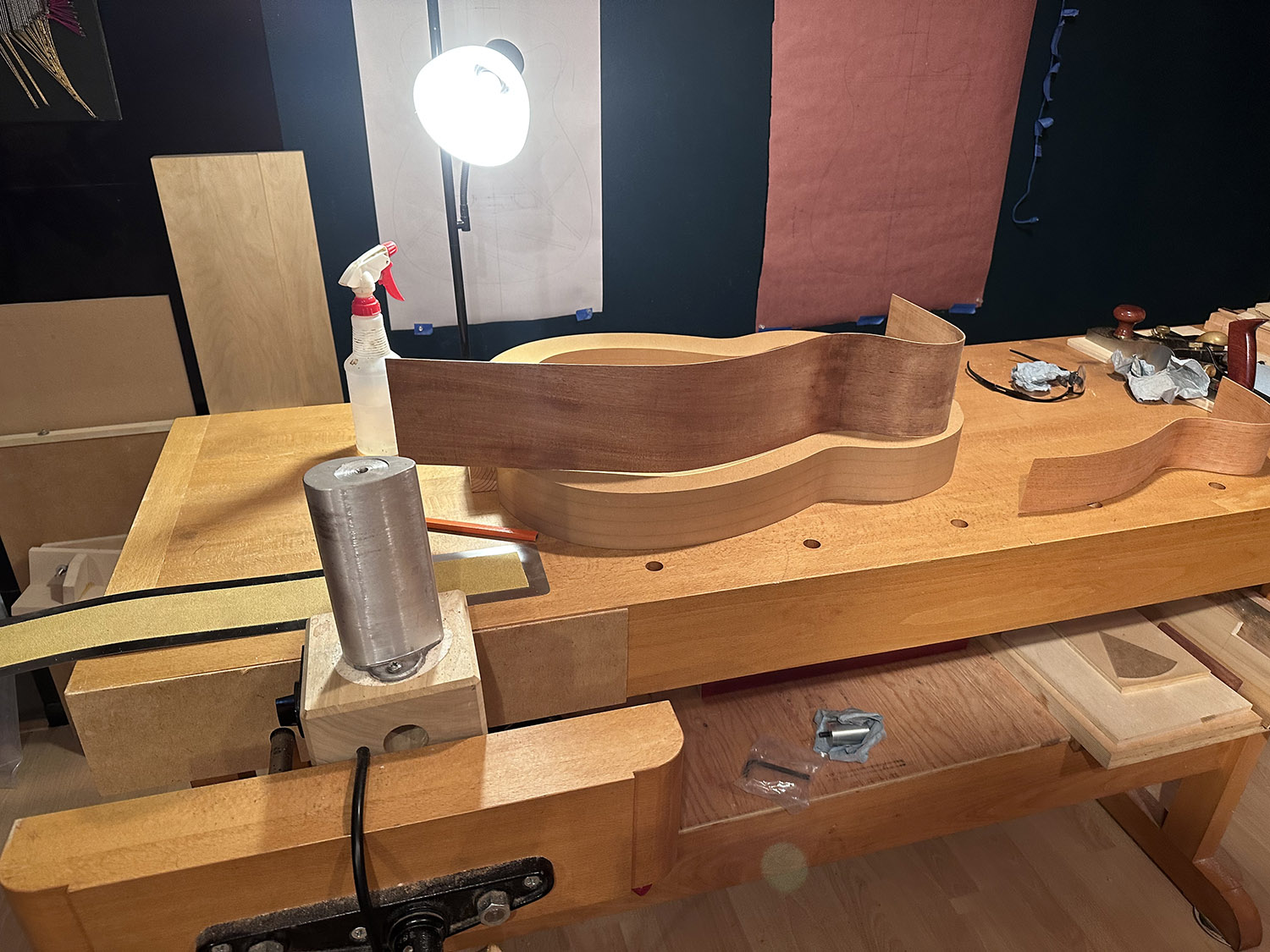 there was a big learning curve to my first foray into side bending. i spent hours getting this far - trying many different ways to get the wood to yield including damp cloth between the wood and iron and boiling water, likely case hardening and making the side brittle in the process.
