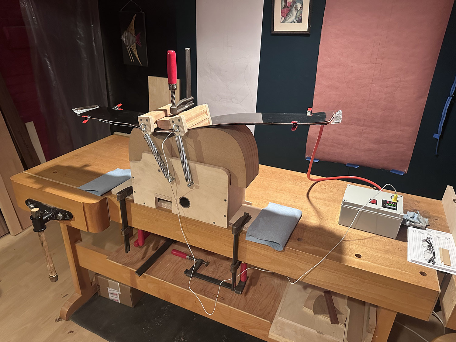 here is first bend test using a piece of walnut. the side wood is moistened and wrapped in foil and sandwhiched between several steel slats with the heating blanket. once the blanket is up to temperature, the outer sprung cauls are slowly pulled over the sandwhich around the form to shape the side.