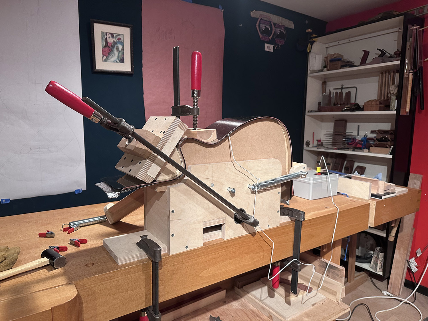 the cutaway uses a separate outer caul. the commercial bending jig has a wooden cutaway ram with a long jack screw; i revised to make use of clamps on hand, anchoring the clamp in a section of steel pipe inset in the bending jig base. after two tries, i have yet to successfully bend a cutaway side without significant cracking.