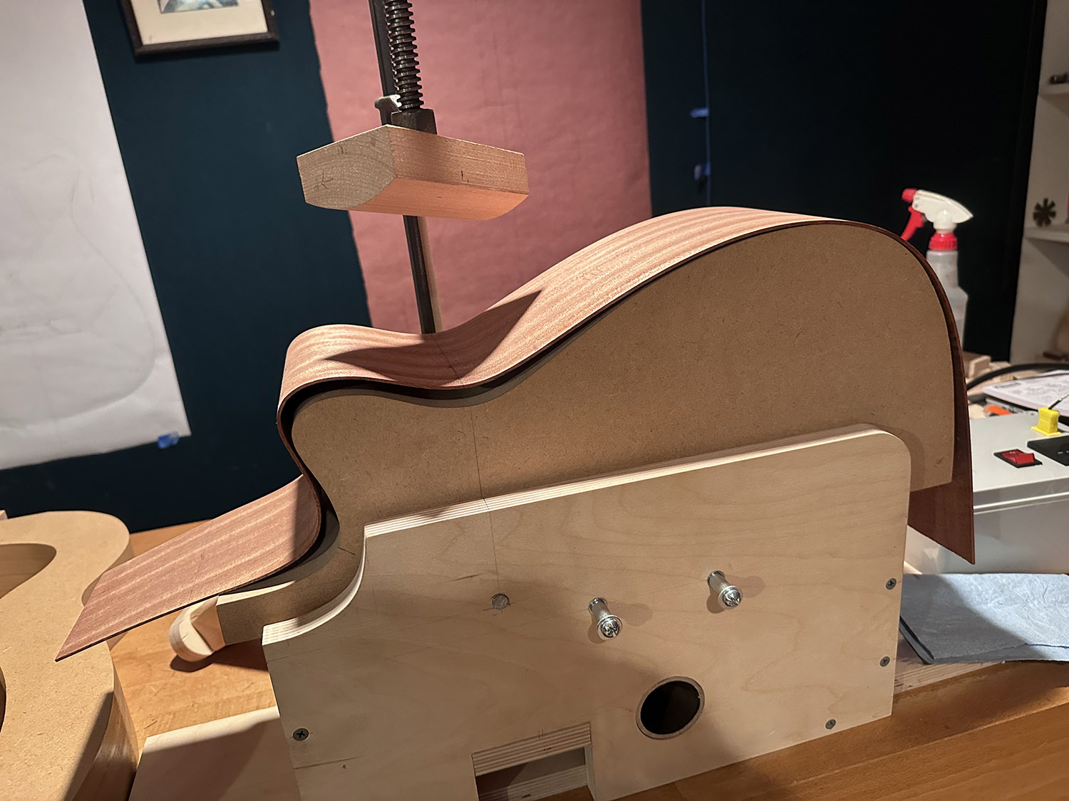 there's still some fine tuning to cut down on springback and address some remaining, but hopefully manageable, minor cracking. this could change when i get back to the planned mahogany - i've been using sapele for dialing in the process. the sapele has a bit of runout which may be contributing to the cracking, but then again i think it is also known to bend more easily than mahogany..