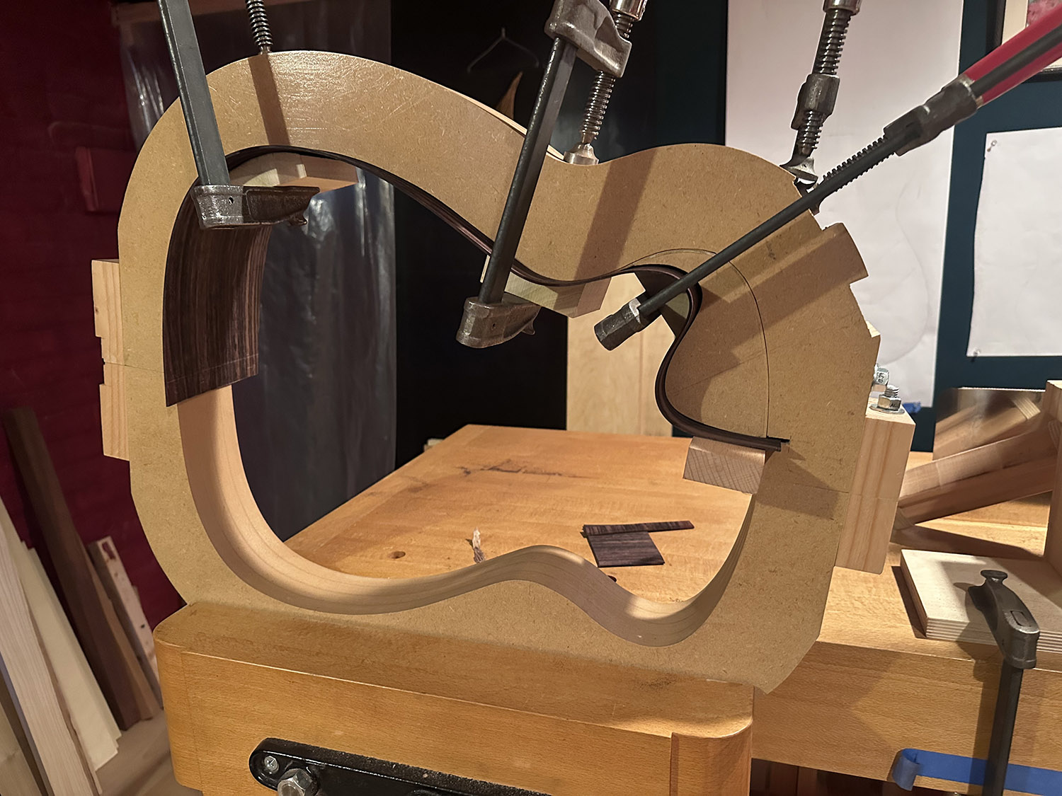the rosewood bent with less springback and no fracturing. there remain some small issues with the bending form for the cutaway - where the ram is not fully seating at the depth of the recurve, which translates into the nose being a bit short as seen here - hopefully this will work out aesthetically and not cause too much tension to be built into the body.