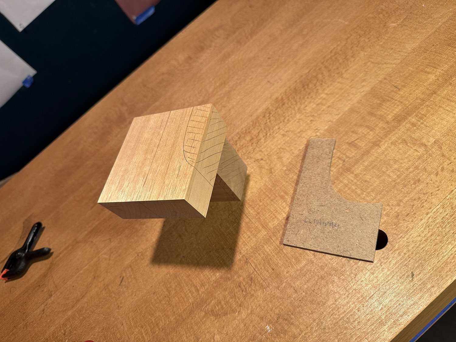 head block made of two separate pieces; marked to correspond to cutaway cutout. the grain direction of each piece is oriented to be best for eventual gluing.