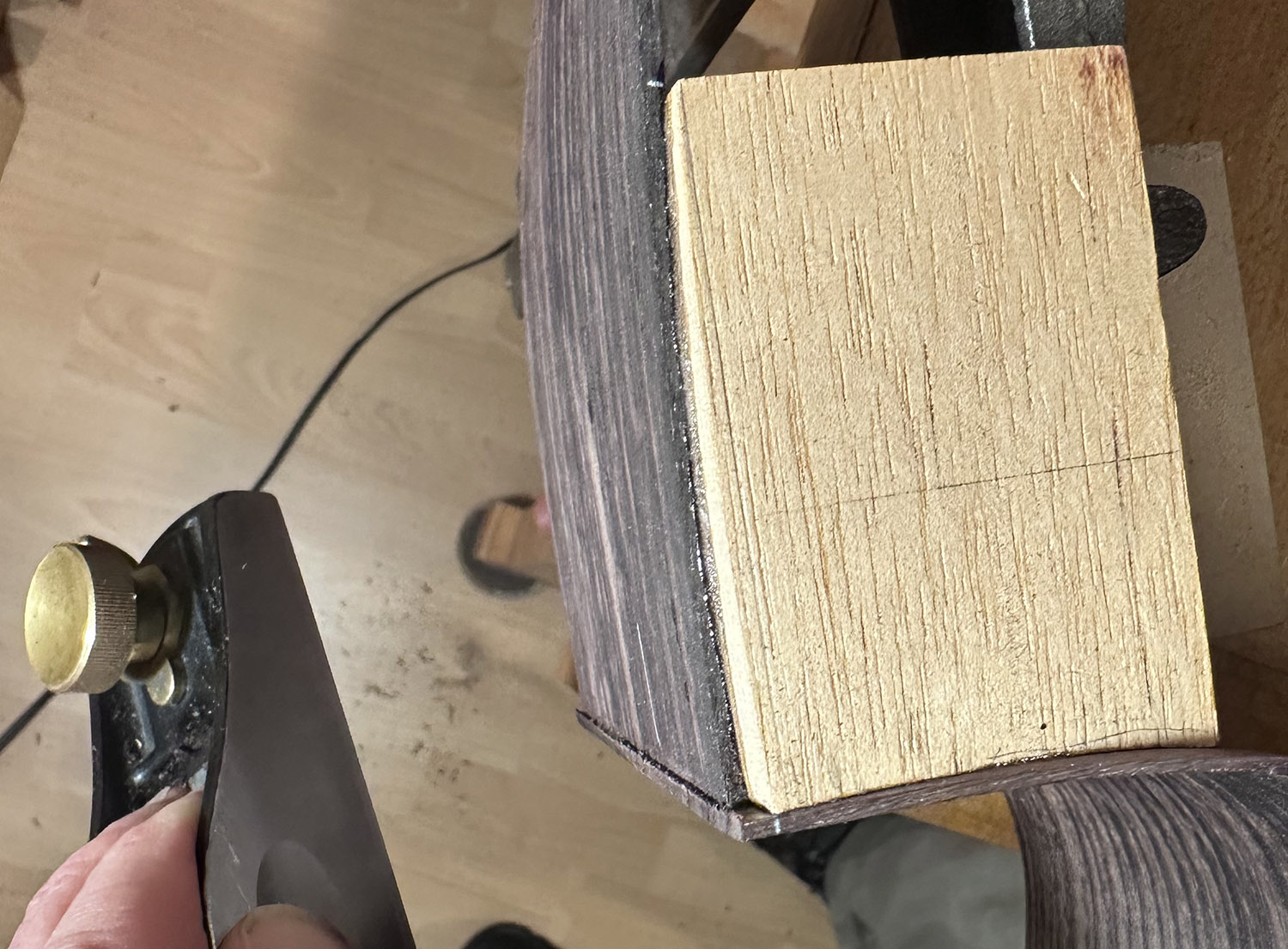 the head side cutaway side extension has been sawn off here. using a low angle block plane to trim flush at the neck joint.