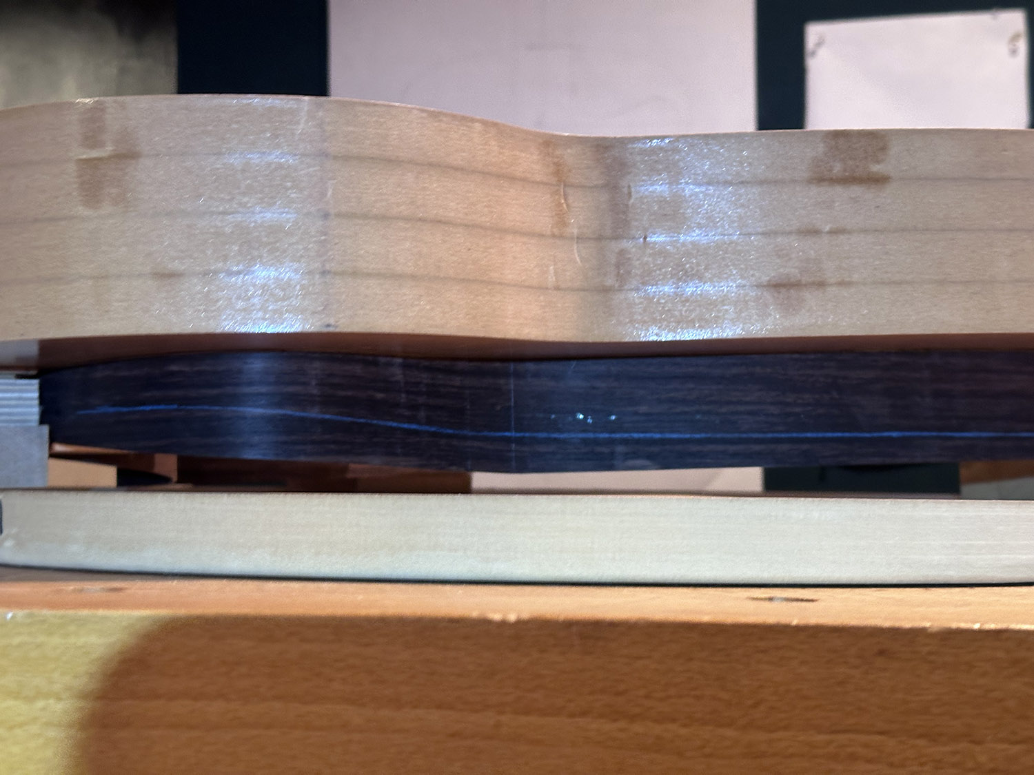 back radius marked on to sides. note the significant amount of material to be removed from the upper bout. this is due to not having a very accurate side profile earlier in the build process.