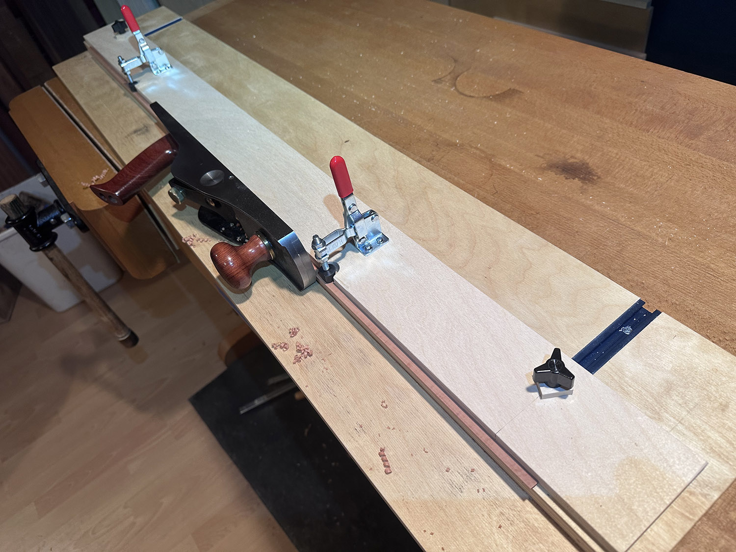 adjustable stop and hold downs added to long shooting board to work with narrow binding strips. here shown making a pear wood binding.
