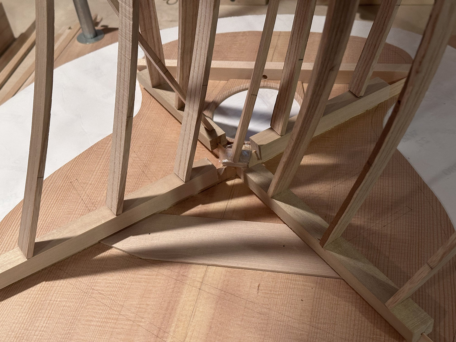 gluing down the x braces, using cauls with gabled notches to avoid crushing the brace tops.
