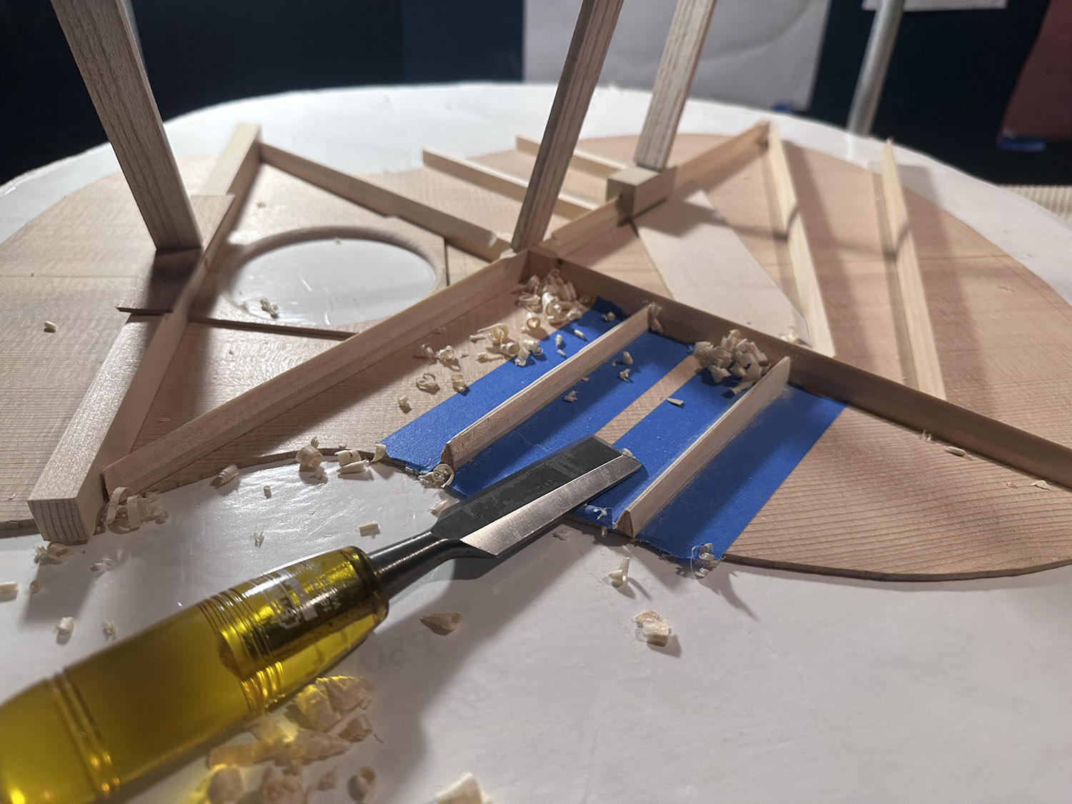 beginning to carve to top braces; using go-bars as hold downs. starting with shaping the triangular cross section of finger braces.