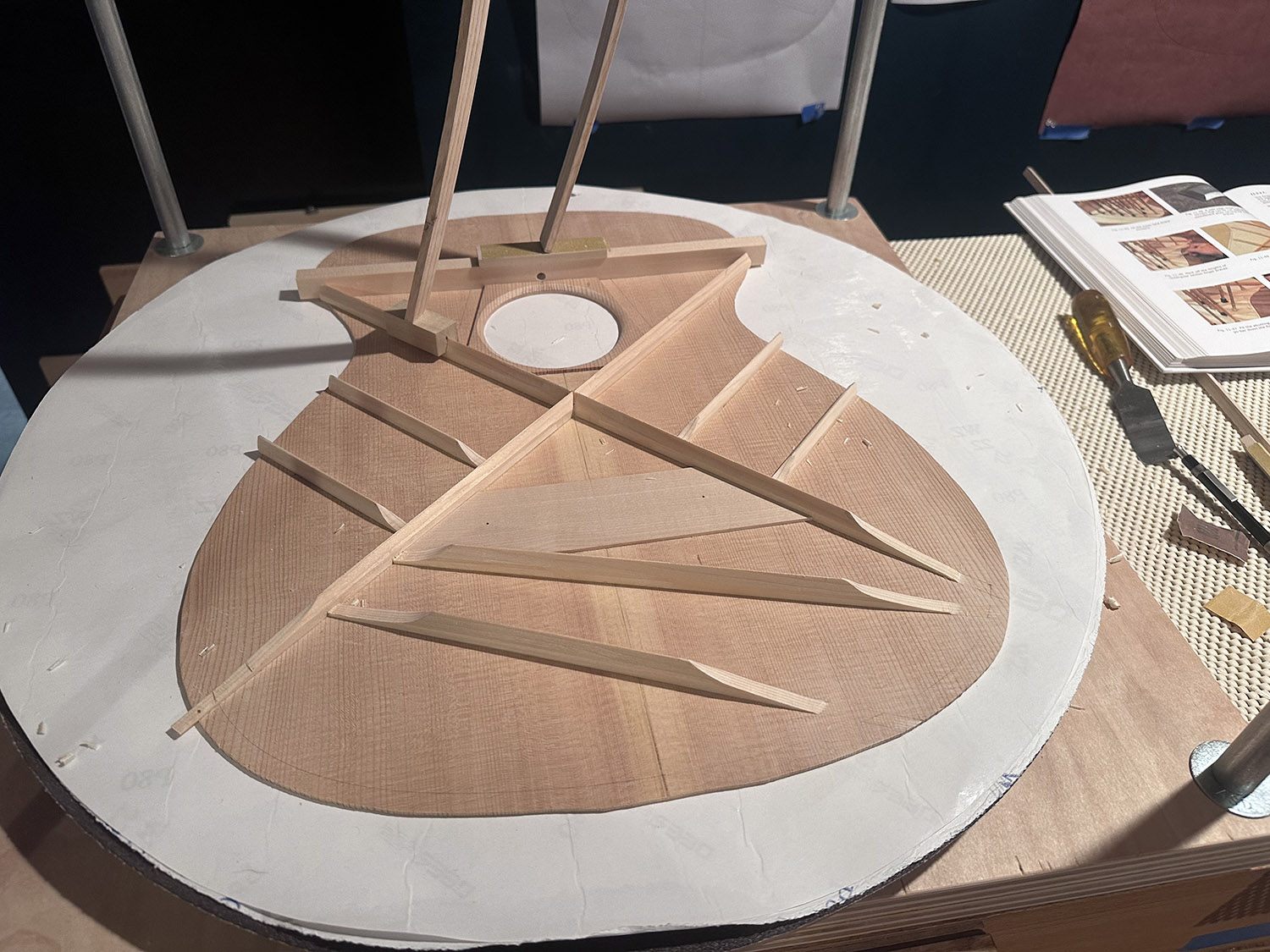 the lower bout braces and finger brances are not let into the linings. here the face braces and one leg of the x brace have been taken back 20mm from the outer profile.