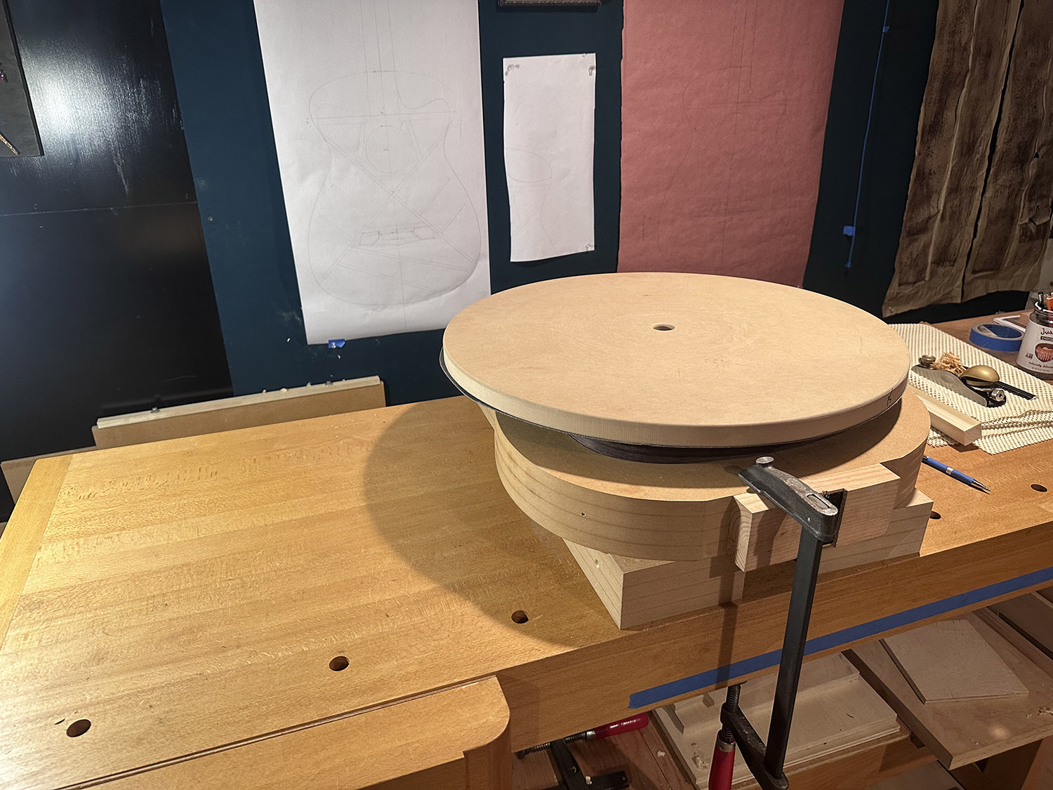 the top and backs are made to closely match their specific radii by final sanding the edges of the sides and the linings using the radius dishes with sandpaper affixed. the dishes are rotated on the clamped down sides until there is an even scratch pattern all the way around.