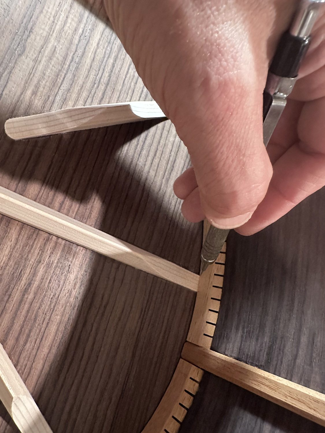 marking the back kerfed linings where the braces will be let into the sides.