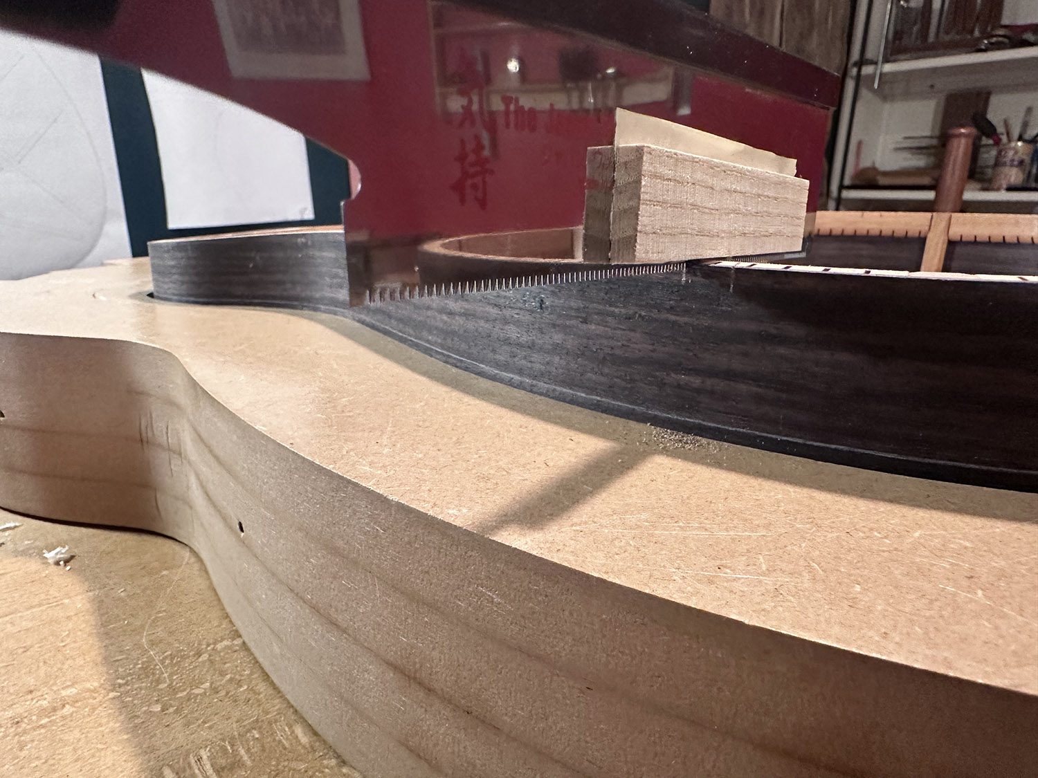 cutting the notches for the back braces in the sides and linings. a stop is taped to the saw to limit the depth of cut.