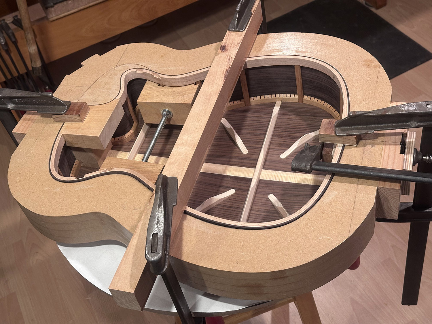gluing the back to the sides after careful fitting and using the radius dish as back caul. there are tonal, moisture exchange, and repairability arguments for and against finishing the inside of the back and sides, but it is common practice to leave the inside unfinished and the gore / gilet book does not specify to do so, so i left it unfinished.