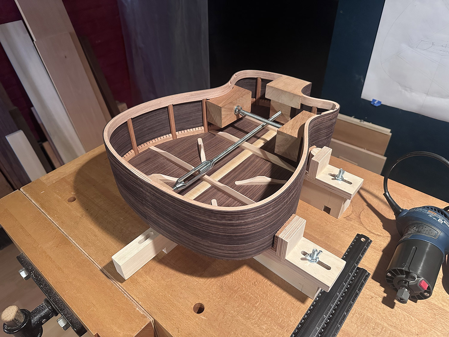 adjustable cradle to hold guitar body when cutting the binding with stand mounted router.