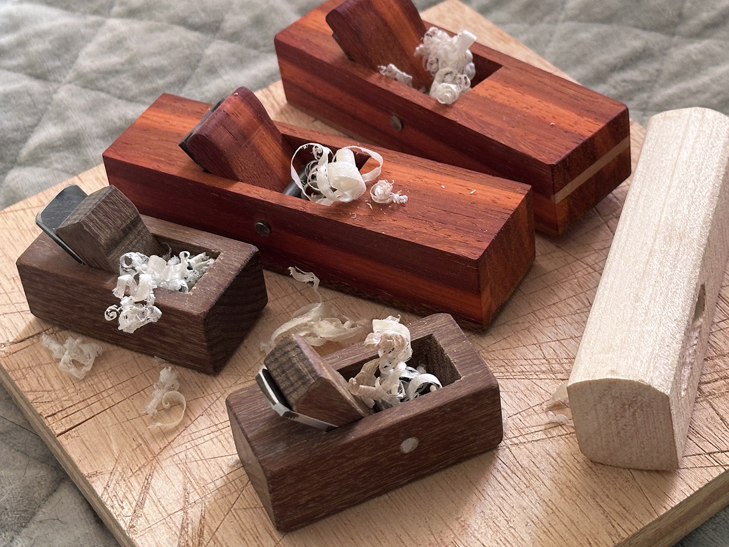 the paduak planes were not short enough for brace tuning in the boxed up body but they seemed useful nonetheless, so i made two more smaller ones from ipé with 1/2" wide blades - again, one with a flat sole and one with a slight curve.
