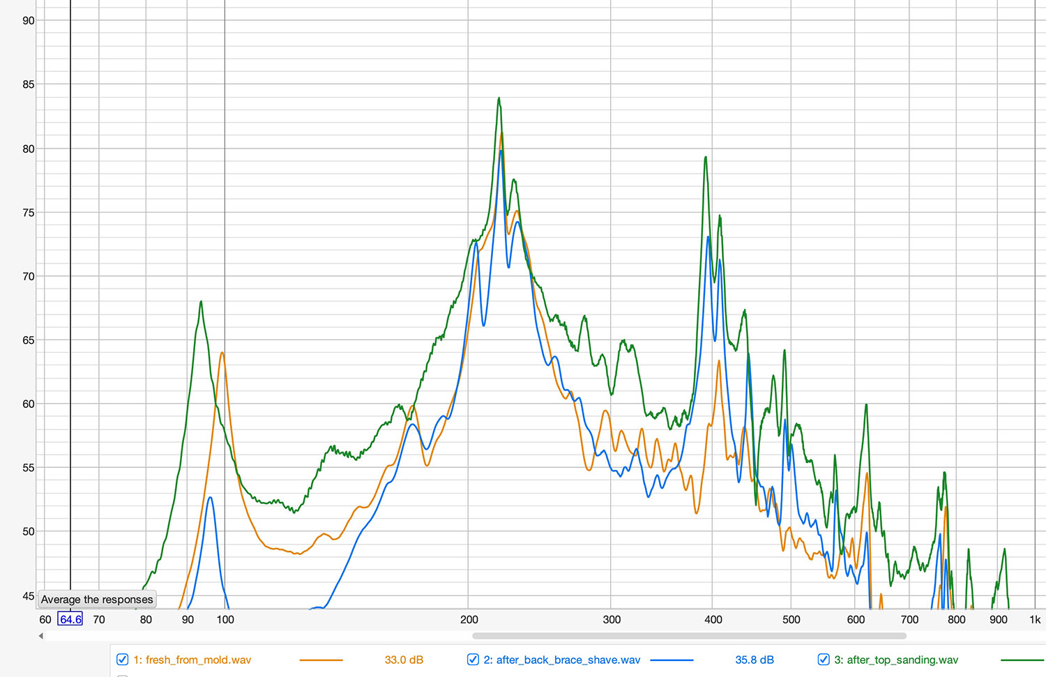 frequency graphs of body fresh from mold, after a small amount of shaving the back lower bout brace, and after reducing thickness of top lower bout at edges. the whole body peak has shifted from 99Hz to 93Hz, the top from 220Hz to 217Hz, and the back went from 229Hz to 226Hz.