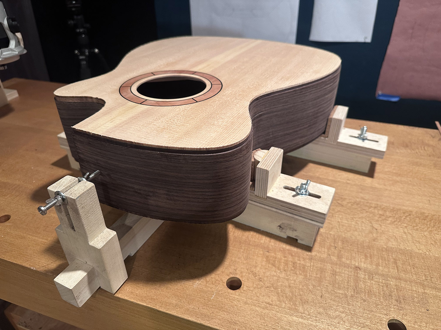 cutting the binding ledges went smoothly. like many of the previous operations, many hours of jig building and tuning ultimately resulted in a few minutes of use and fairly clean results. that said, there remained a bit of cleanup in the endgrain where the cutter did not fully severe all the fibers - moreso in the spruce soundboard, but also a bit in the rosewood back.