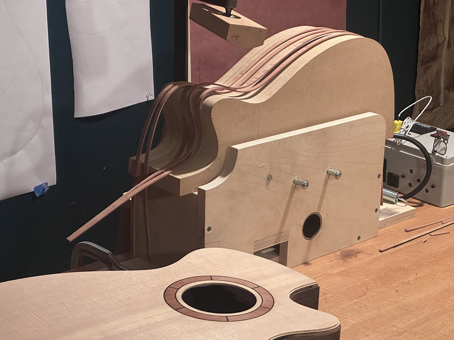 test bent bindings in the bending jig. hopefully bending the binding with the added purfling strips will also go smoothly.