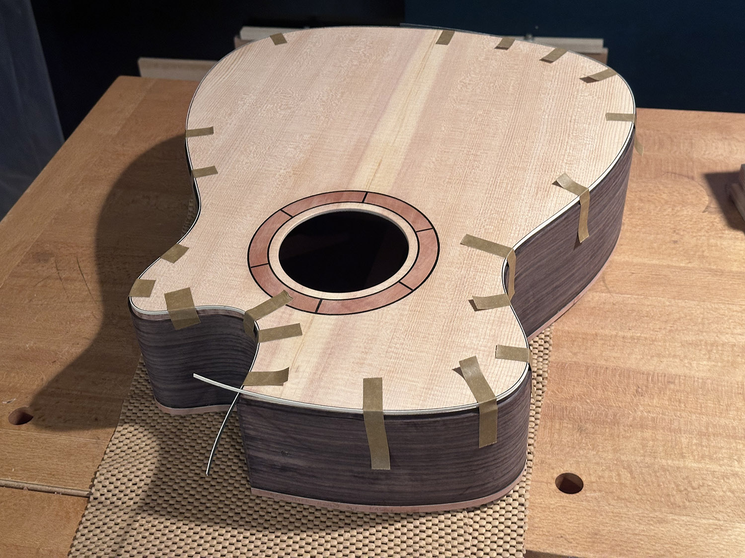 the purflings are composed of a black and white strip and an additional black strip to increase the thickness of the inner black line. the black and white strips were bent using the hot iron, while the separate black strip was flexible enough to not require pre-bending. shown here are the bent purflings taped in place to set after bending.