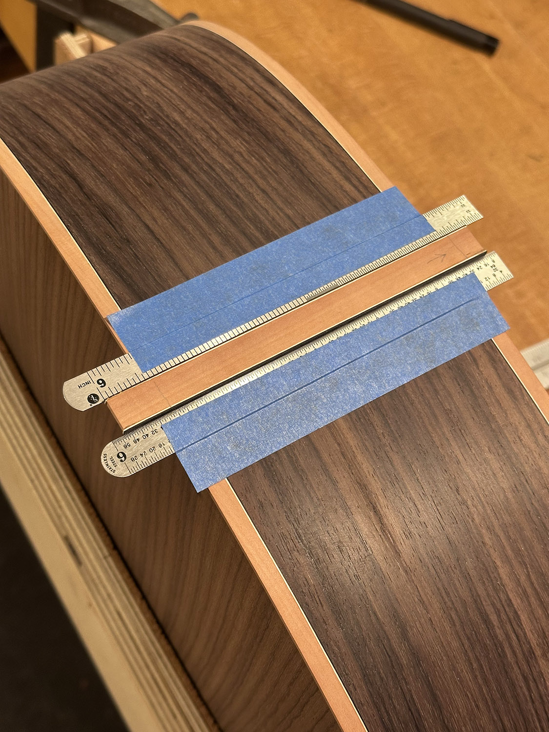 preparing to cut the mortise for the tail strip with attached purfling.