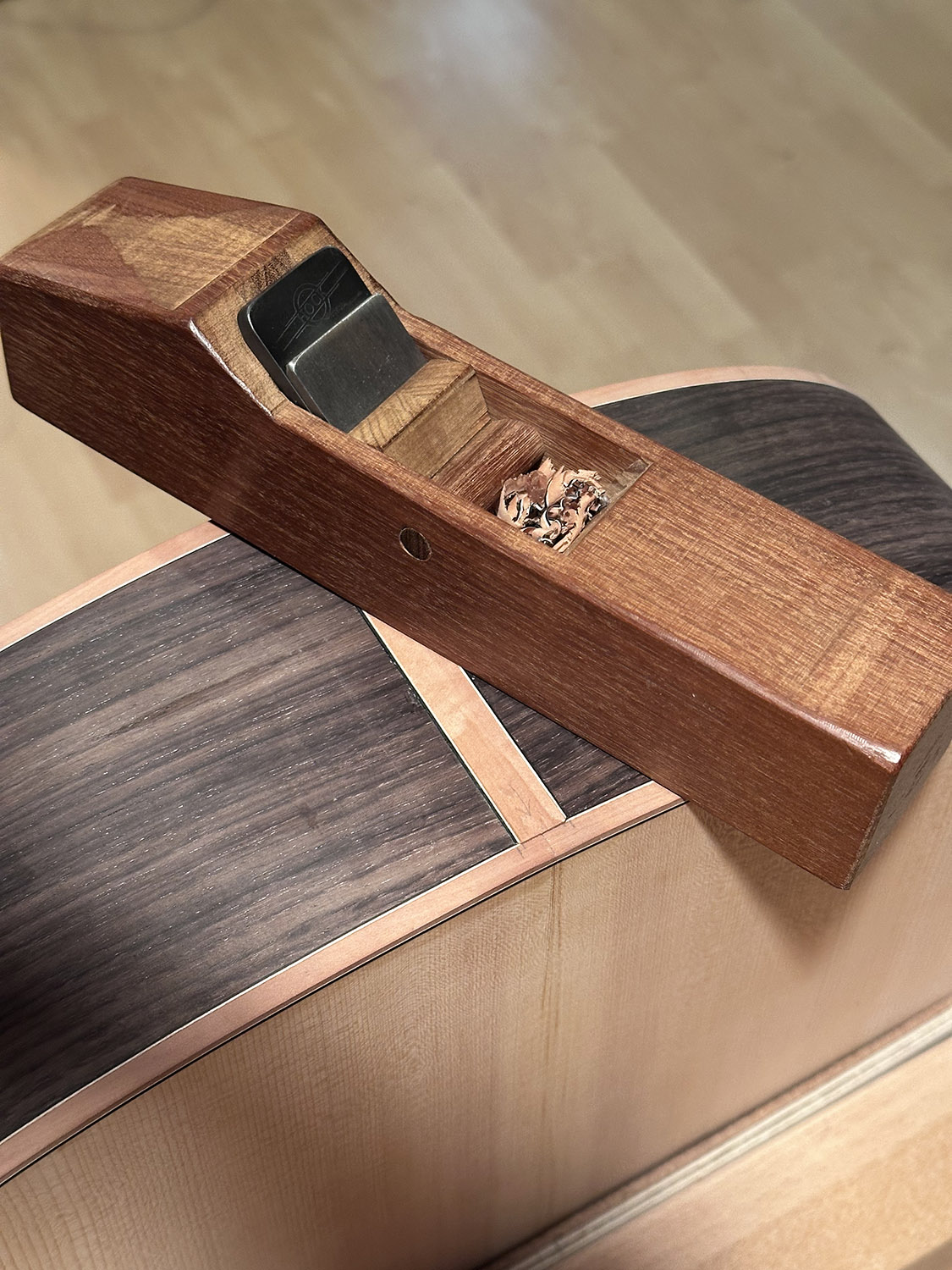 leveling the tail strip with hand plane after gluing it in place.