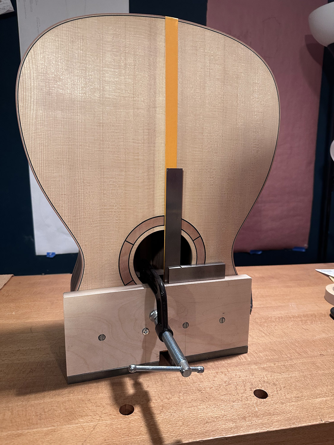 body mounted in jig to mortise neck joint. the lower bout face is the reference plane, and the top side of the upper bout where the mortise will be cut is off of square to that plane by a few degrees - thus the body does not sit flat on the horizontal plate. tape applied to the centerline of the soundboard and used as squaring reference when clamping the body to the jig. squaring is further helped by seeing the tape/center line through the mortising slot.