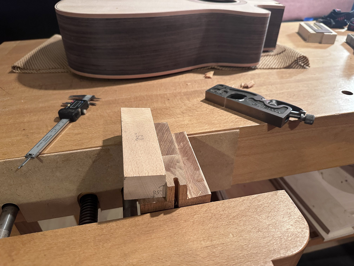 final refinement of the neck tenon thickness using a sanding block with 85 degree corner to match the undercut angle formed by the tenon and the shoulders of the joint.