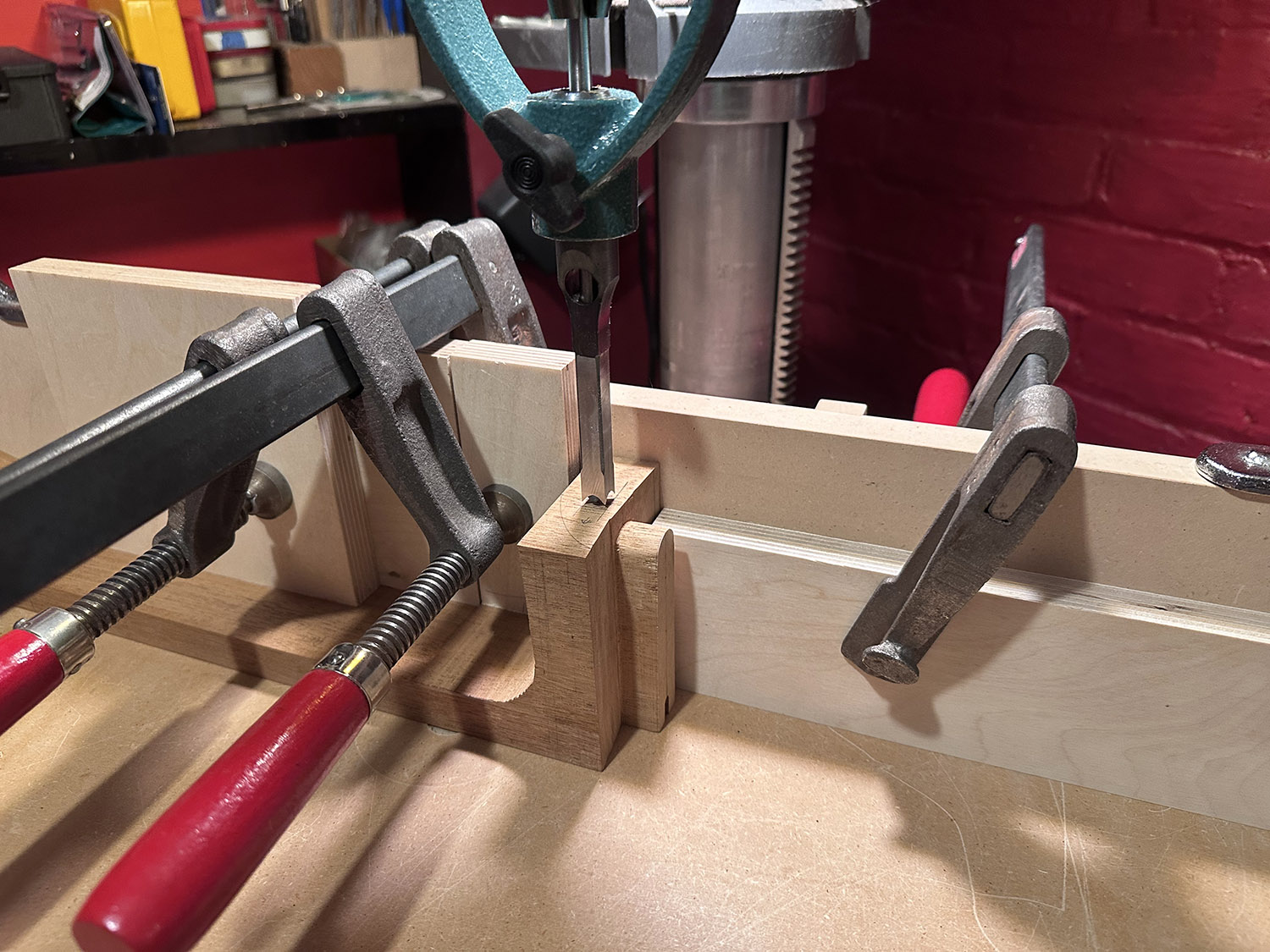 using a hollow chisel mortise bit in the drill press to cut the square hole that holds a brass bar that will be tapped to receive the bolts that hold the neck to the body.