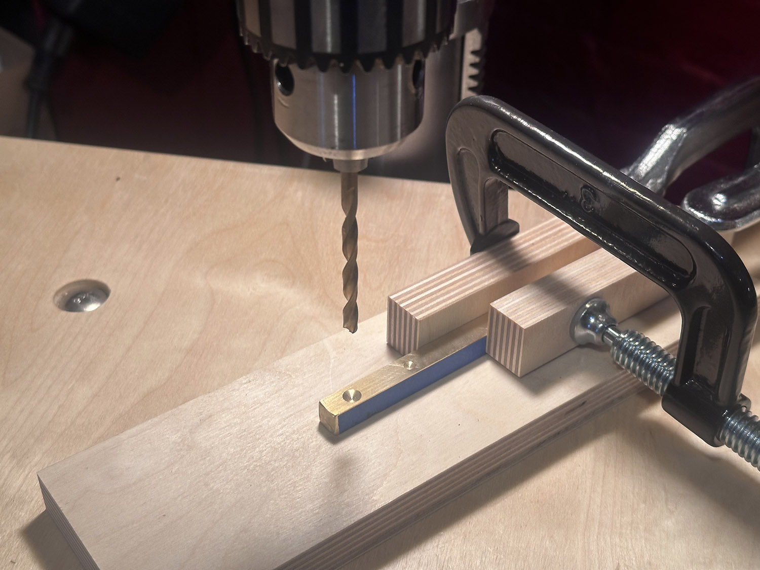 boring holes in the brass bar that will subsequently be tapped to receive the attachment bolts.