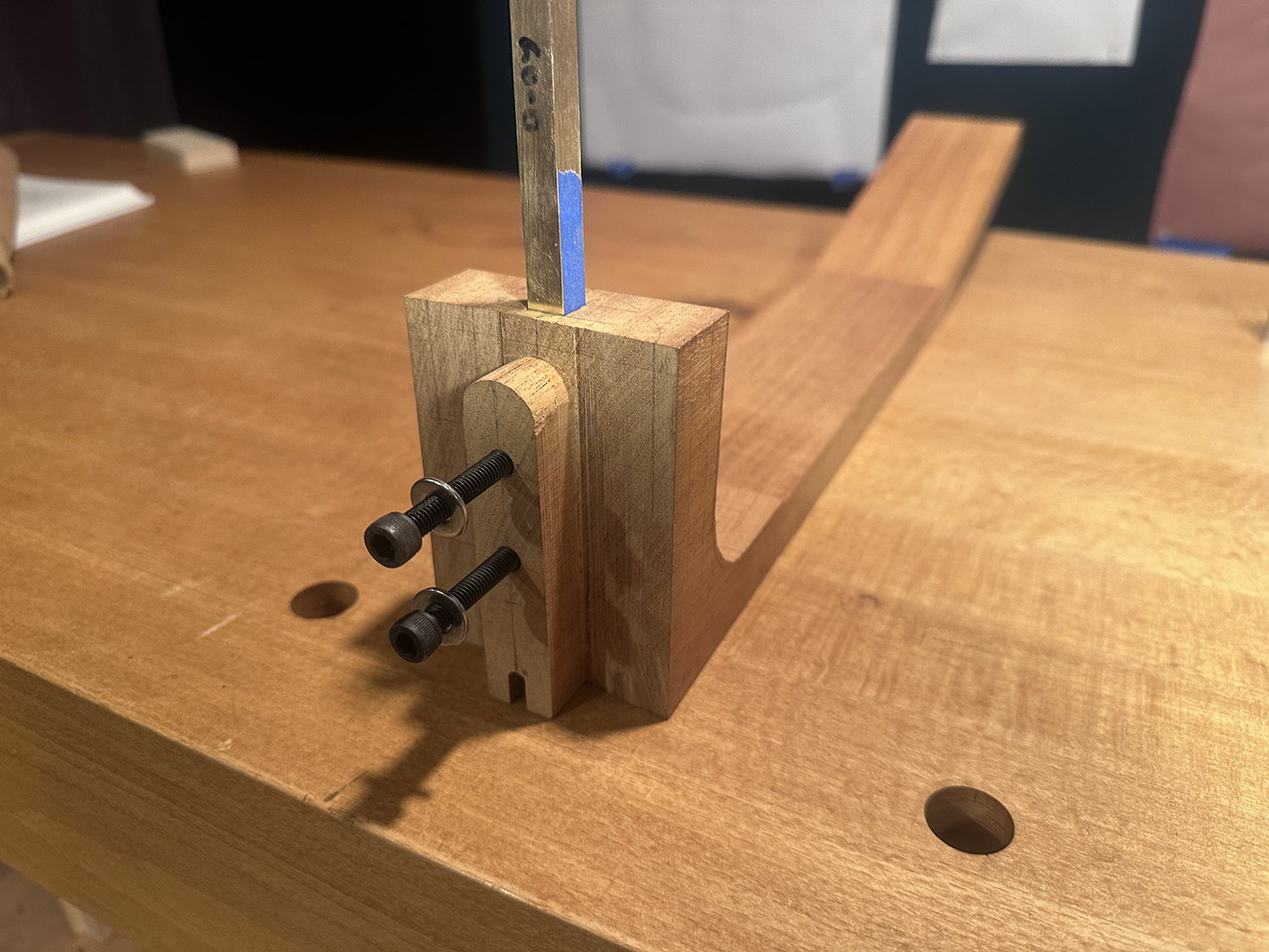 the drilled and tapped brass bar in place in the heel of the neck with attachment bolts, prior to cutting it to length.