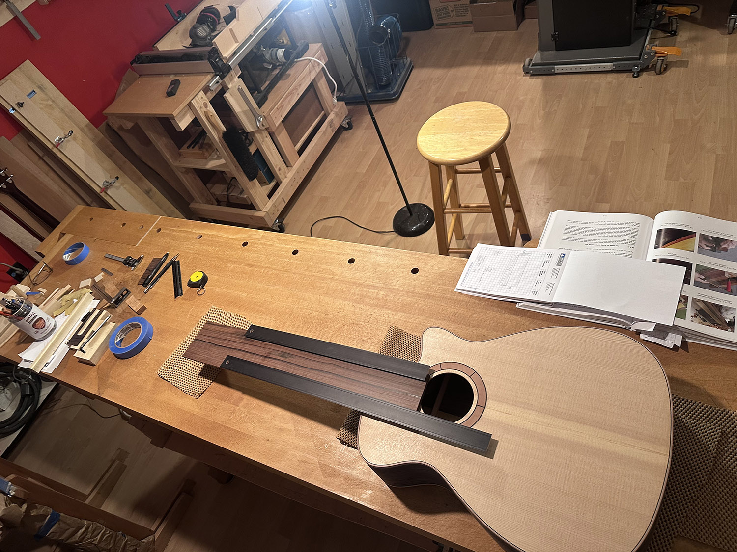 perhaps the palisander rosewood will work. the lines reinforce the area of heartwood in the spruce top. maybe ebony or pearwood binding or other details in the fretboard.