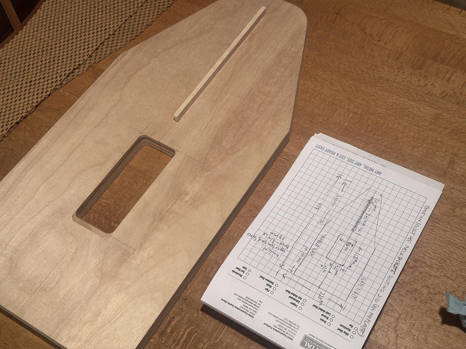 shown here is the jig for cutting the upper mortise. it indexes off of the truss rod slot in the neck. note the patched bit in bottom of the rectanglular cutout - this part of the mortise will need to precisely line up with the upper transverse brace which was earlier drilled with a hole to access the truss rod. luckily i measured twice even after initially making the jig. |