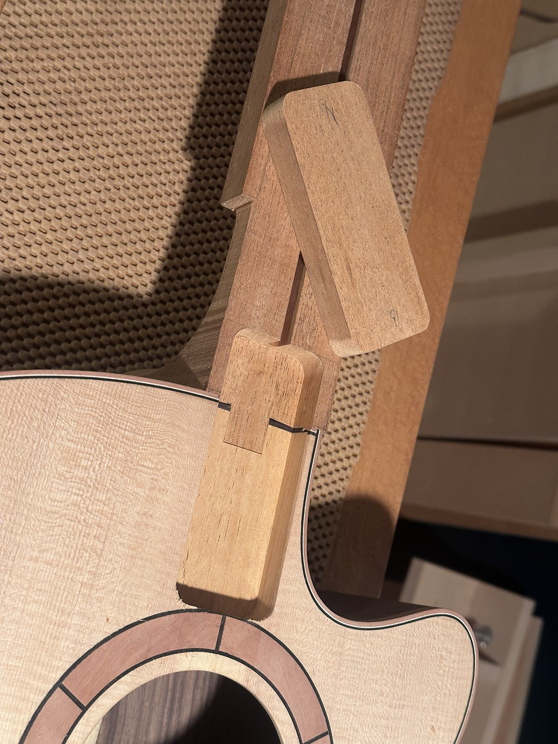 the finished upper mortise with the tenon that will span the neck and body. the tenon will be glued to the neck but not the body.