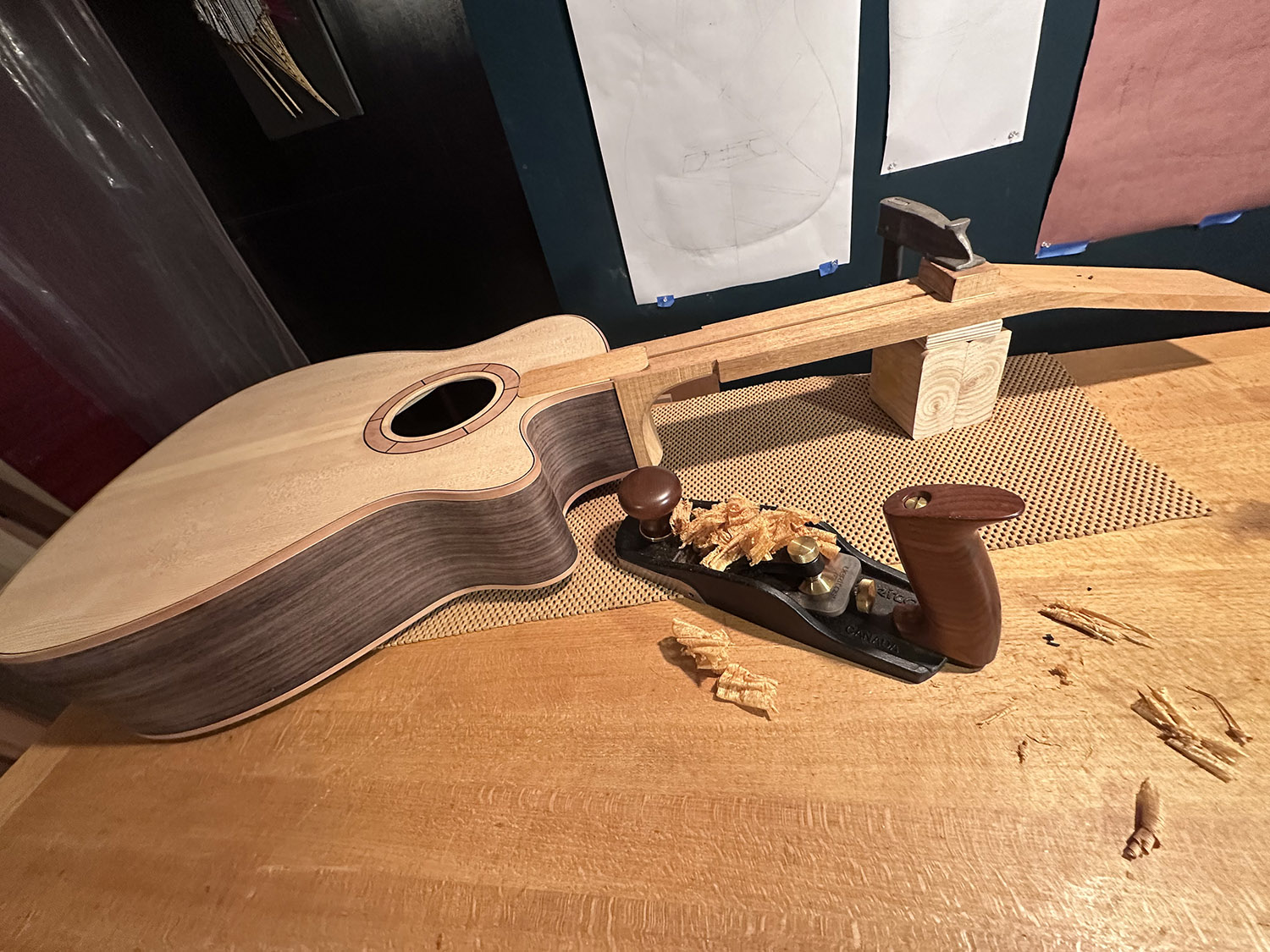 leveling the upper tenon across the neck and upper bout of the body. at each step of making the neck joint i recheck the geometry between the neck and body: the center line of the neck through the truss rod slot should align precisely along the bookmatch top seam, and the plane of the neck should be coincident with the upper bout and result in a rise of 2.5mm at the saddle position.