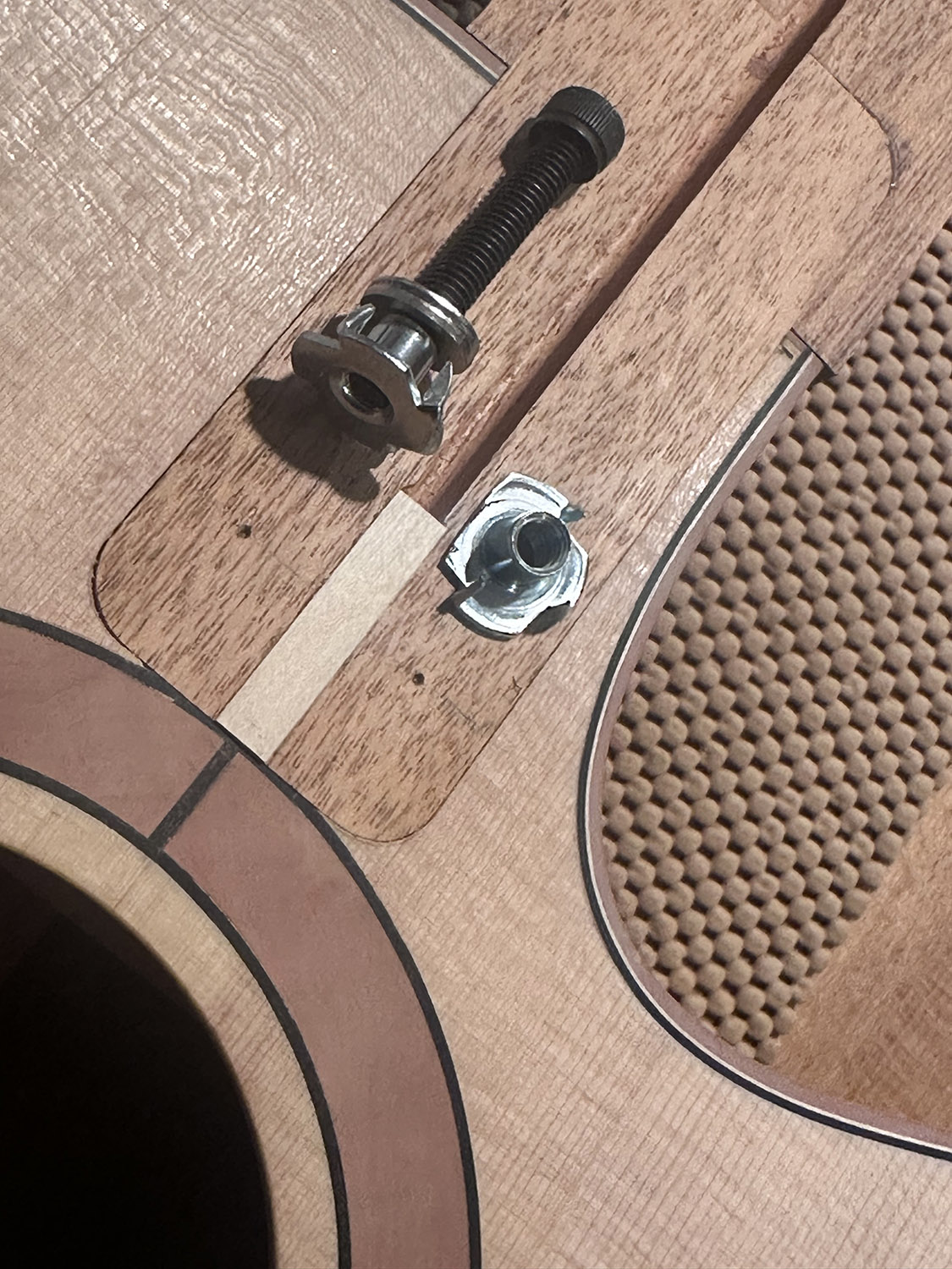 laying out the position of the t-nuts that will be embedded in the upper tenon to receive bolts from the head block. the truss rod slot is slightly off center in the tenon due to the asymetry of the cutaway. i ground off one side of one of the t-nuts to allow it to be placed inside the tenon's edges. a scrap of wood is shown in the widened end of the truss rod slot - to eliminate tear out when cutting the slot and also to allow clamping of the tenon when drilling and pressing the t-nuts into the tenon.