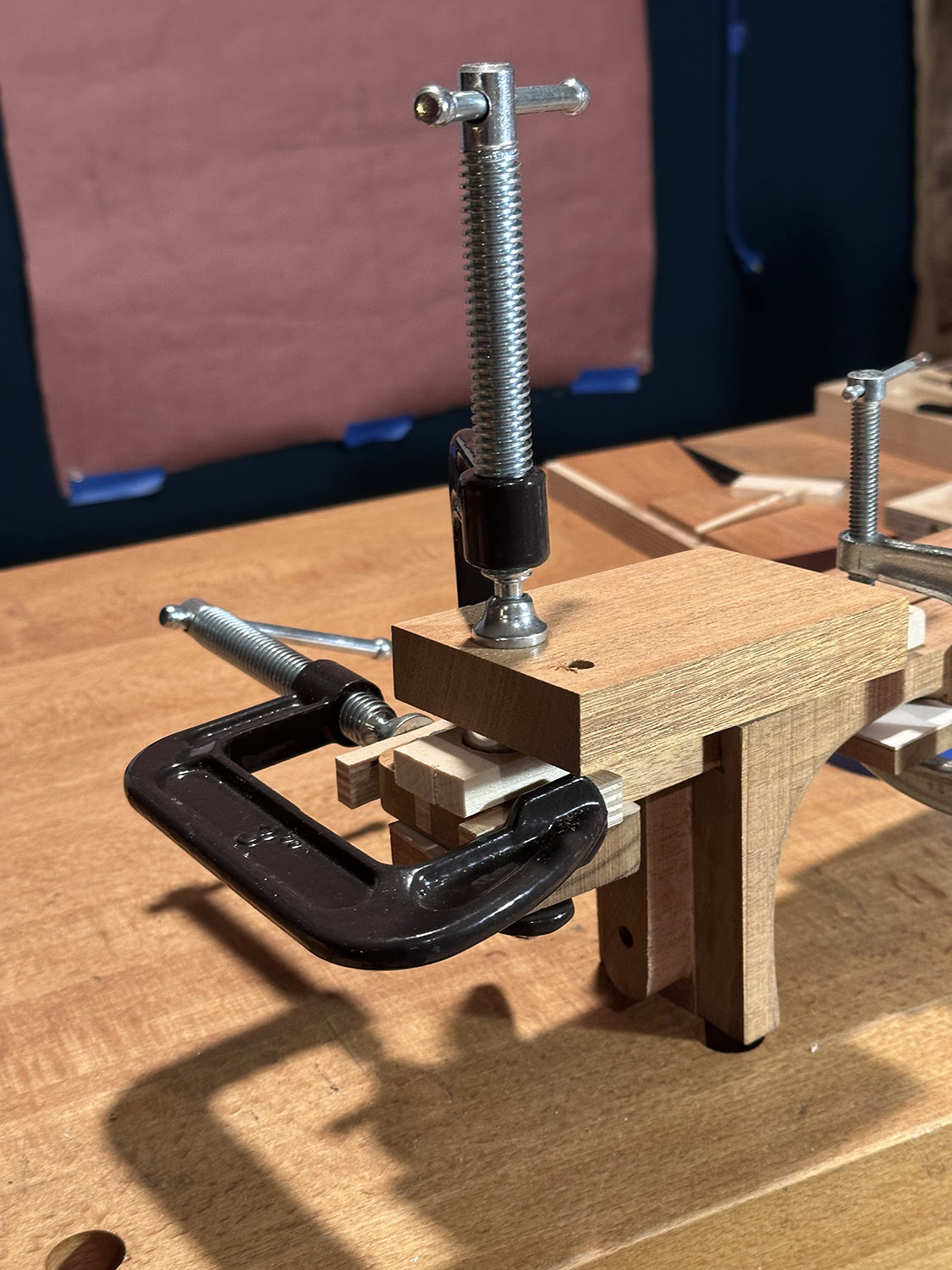 pressing the t-nuts into the tenon using a clamp to apply pressure to a caul seated over a socket that is on top of the t-nut.