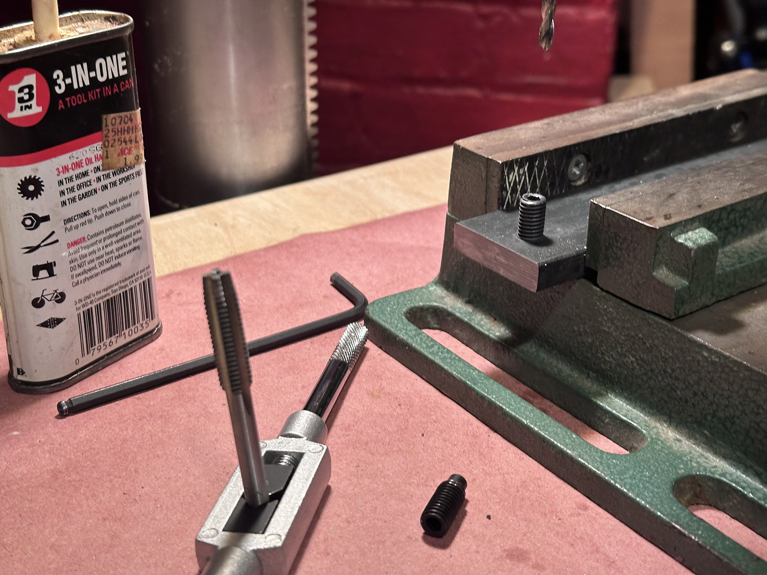 after tempering the set screw it is placed in a tapped hole in a steel plate for drilling.