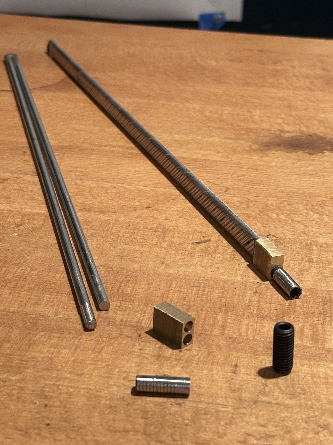 the trial and final finished truss rods. note that tapped set screws have their outer threads ground off - having become a long threaded nut that accepts a hex wrench.
