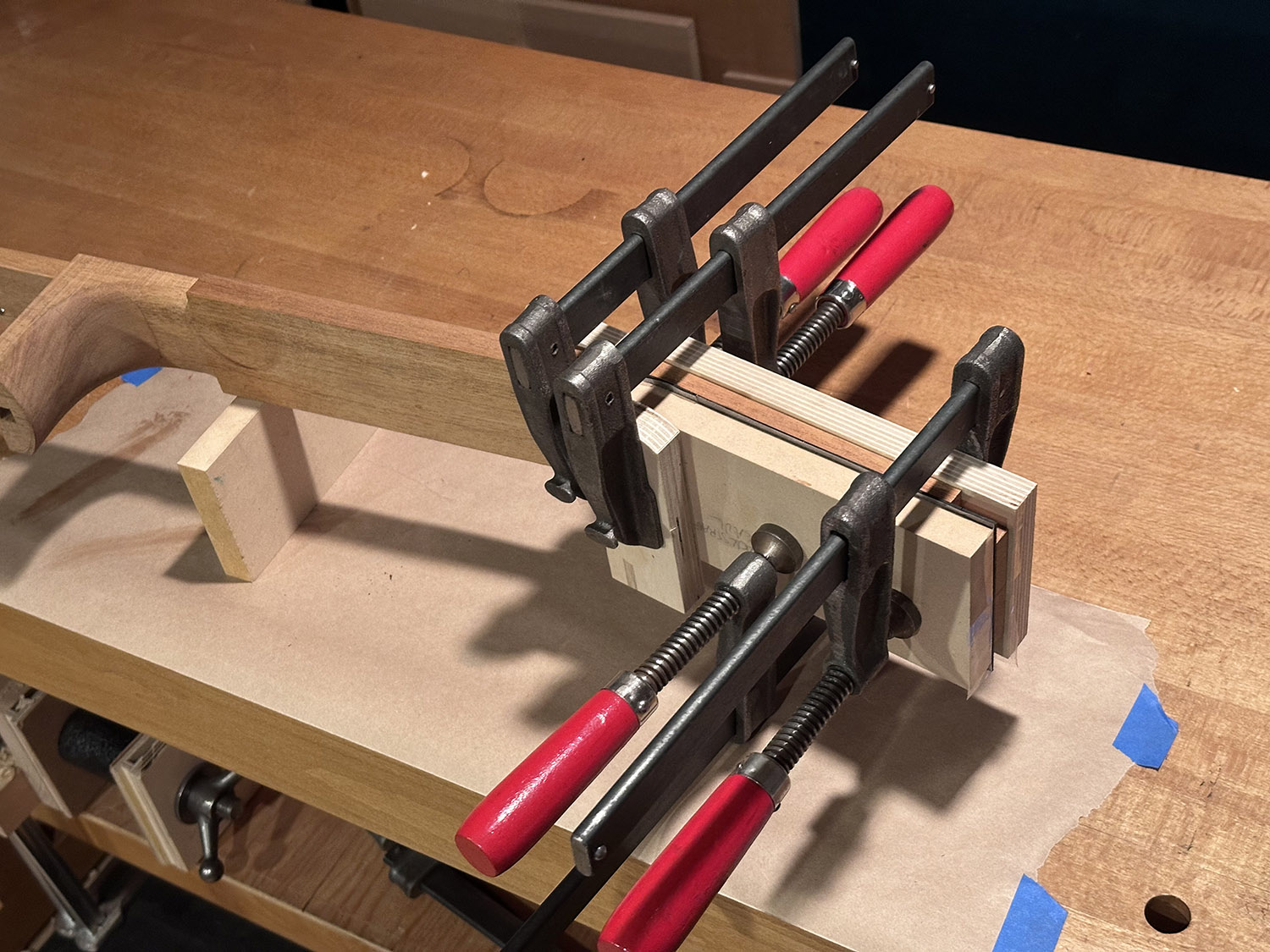 gluing the ebony headstock backstrap. here i deviated from gore and gilet. it was not in my planning so it took some careful thinking about the transition from neck to headstock as well final headstock thickness. hopefully the dimensional math will pan out.