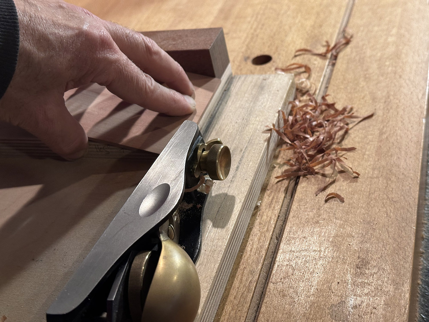 the faceplate of the headstock forms the back edge of the nut and is also used as the reference edge when gluing on the fretboard. here the leading edge is mitered to 15 degrees to match the angle of the headstock.