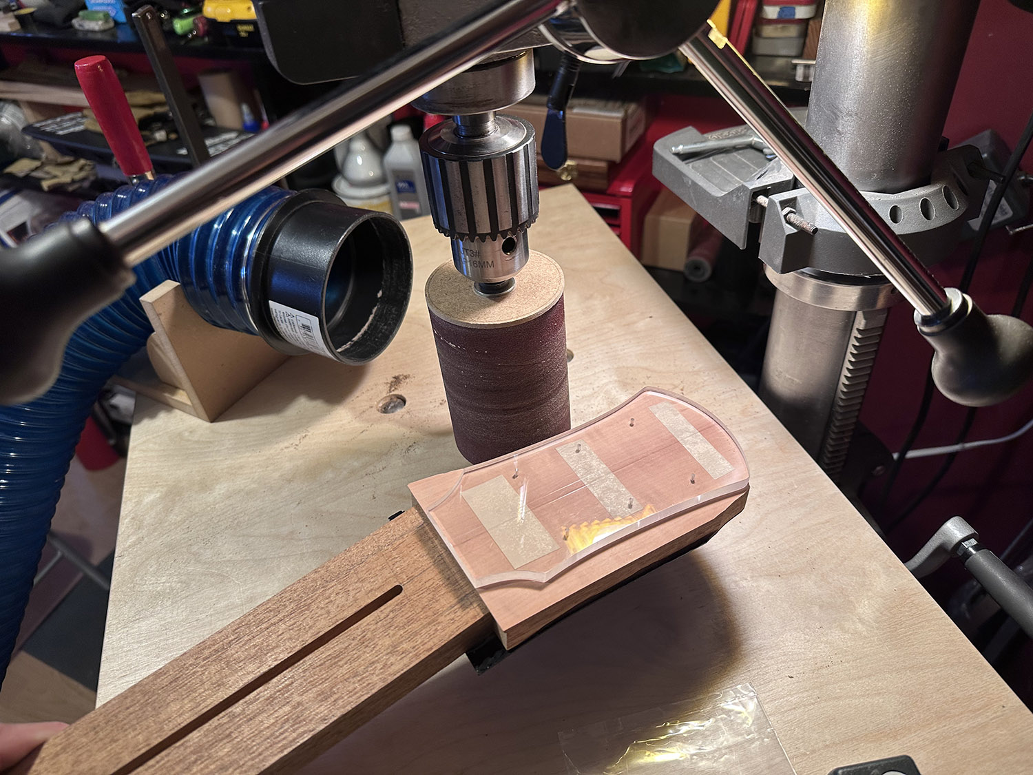 the outer headstock shape is pattern routed using the acrylic template. prior to routing the majority of the waste is bandsawn, and drum sanded very close to the pattern so there is little chance for the bit to catch prior to engaging the bearing.
