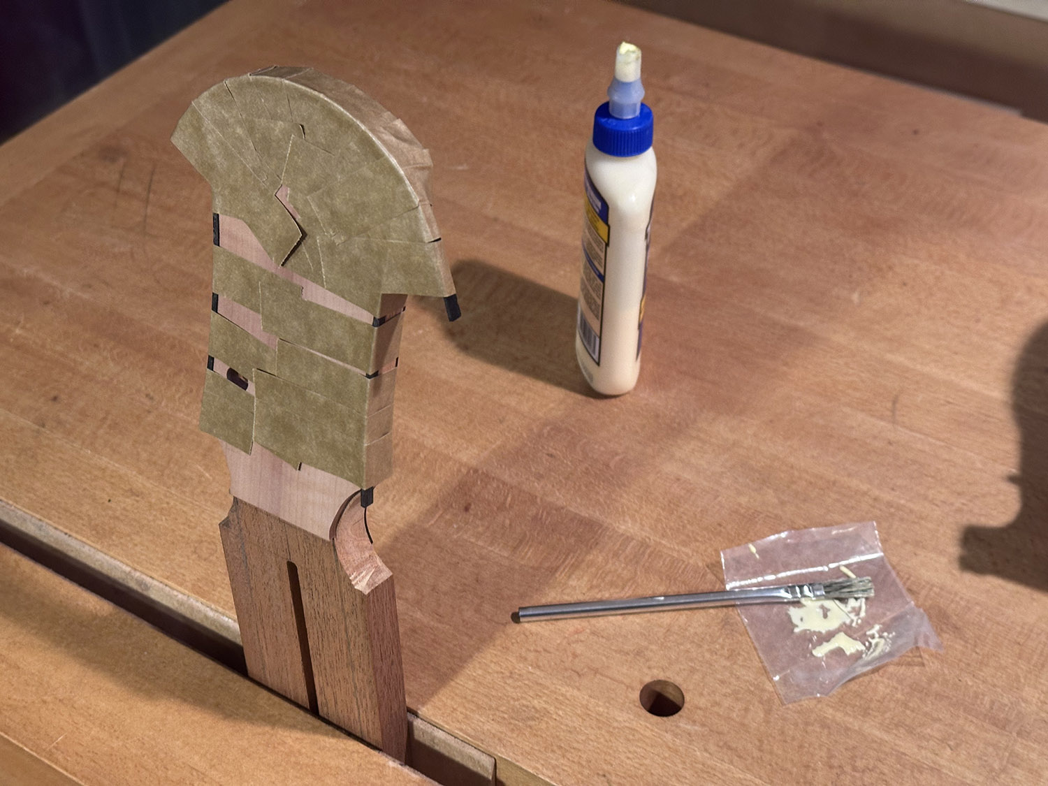 gluing on the headstock binding, except the lower two curves.