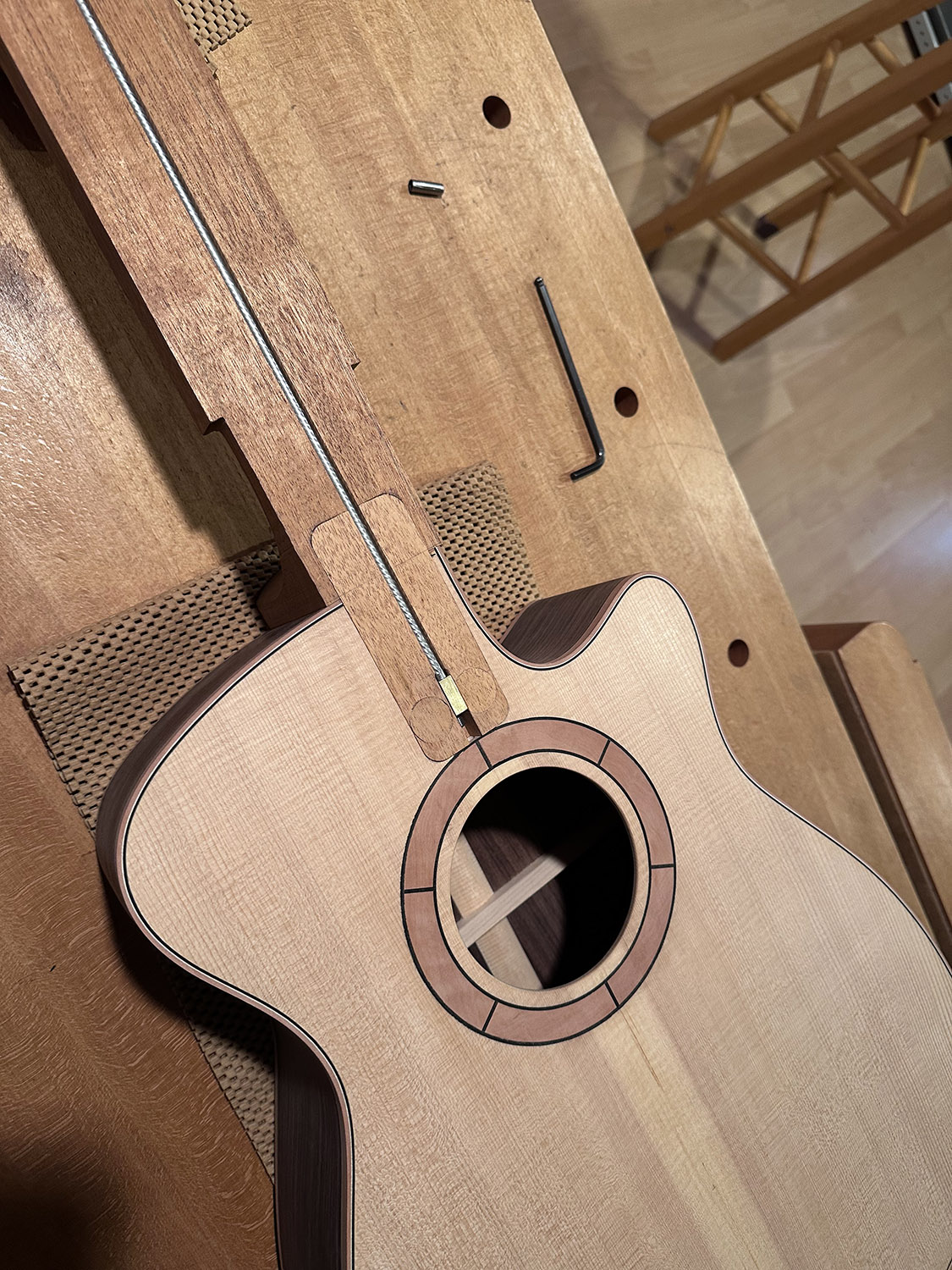 preparing for gluing on the fretboard. the truss rod is lightly waxed to resist glue and circular veneers are made to cover the neck extension t-nuts.