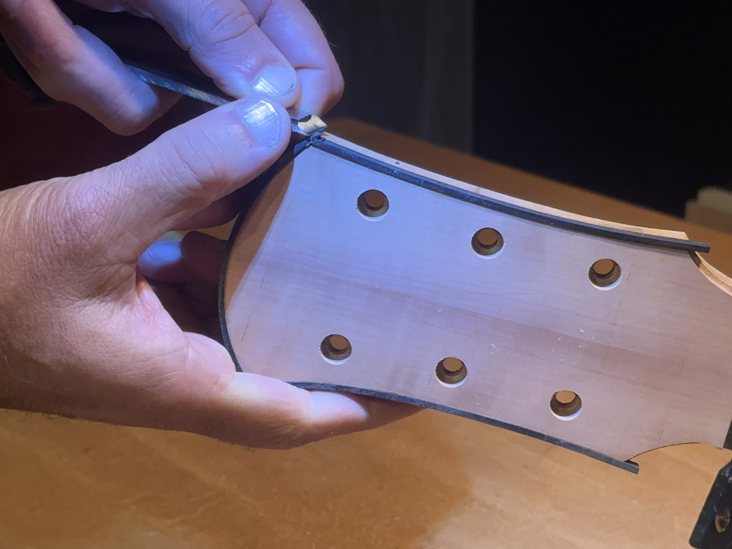 cleaning up the headstock binding after the glue has dried.