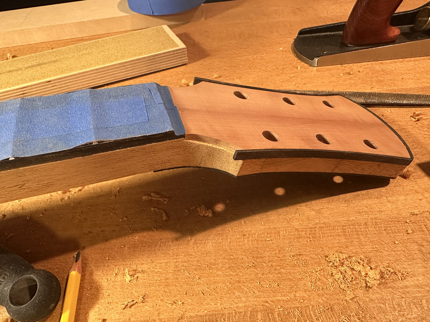the sides of the neck are shaved down flush to the fretboard and square to the back face of the neck. the next steps for the lower headstock bindings are becoming clearer.